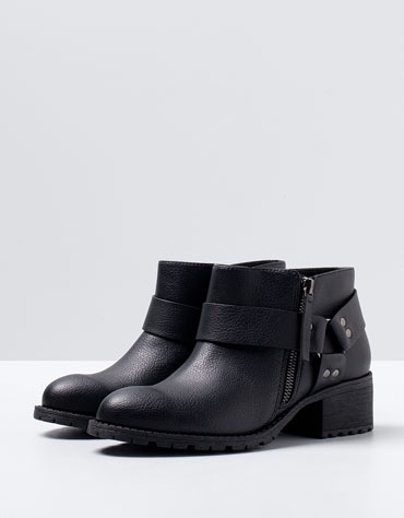 Como calzado, lo mejor son los botines son muy cómodos y calentitos. Podemos optar por unos planos o con algo de tacón. Botines negros de Bershka